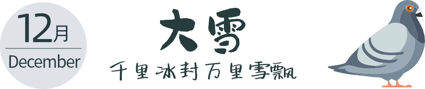 公歷每年的十二月七日前后為大雪。此時(shí)太陽(yáng)直射點(diǎn)快接近南回歸線(xiàn), 北半球晝短夜長(cháng)。此時(shí)天氣降雪比小雪時(shí)更大更多, 氣溫也更低, 故有此名。