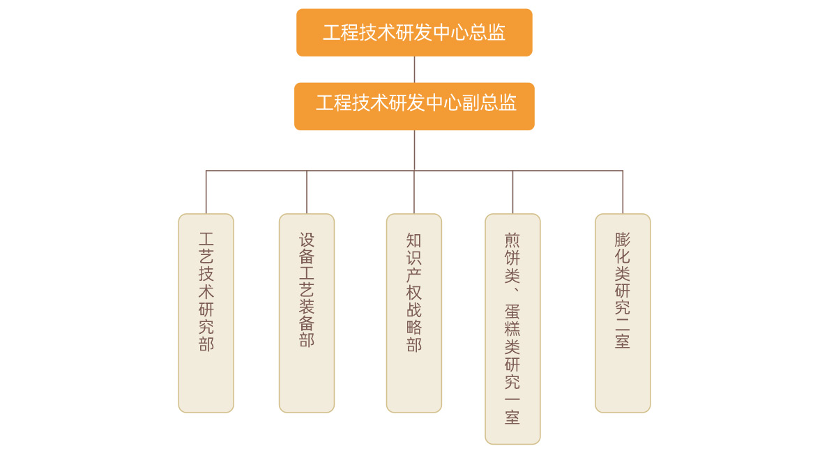 我們的研發(fā)系統由工藝技術(shù)研究部、設備工藝裝備部,知識產(chǎn)權戰略部和2個(gè)實(shí)驗室(煎餅類(lèi)、蛋糕類(lèi)研究一室、膨化類(lèi)研究二室)組成。