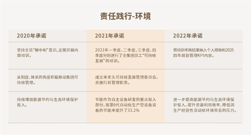 從 2022 年度起,我們制定了集團的四年發(fā)展規劃,一切都圍繞著(zhù)“可持續發(fā)展”的有效開(kāi)展,堅定遵循中國企業(yè)“3+1”的可持續發(fā)展模式加快整個(gè)集團的可持續發(fā)展活動(dòng)。特別是,我們將為子孫后代留下綠水青山,為減少碳排放而努力,以實(shí)現“長(cháng)期環(huán)境愿景”中規定的2050年碳中和。加強在采購、生產(chǎn)、倉儲運輸、產(chǎn)品設計的每個(gè)業(yè)務(wù)環(huán)節,都經(jīng)過(guò)嚴格且全面的流程審改,以建立負責任的供應鏈。我們將開(kāi)發(fā)比以前更開(kāi)闊視野的新舉措。此外,在公司內部,新的“米老頭品牌理念責任人”已分配到每個(gè)工作場(chǎng)所,并加強了制度,以促進(jìn)“健康理念”口號的實(shí)現和每位員工對可持續發(fā)展的理解的滲透。